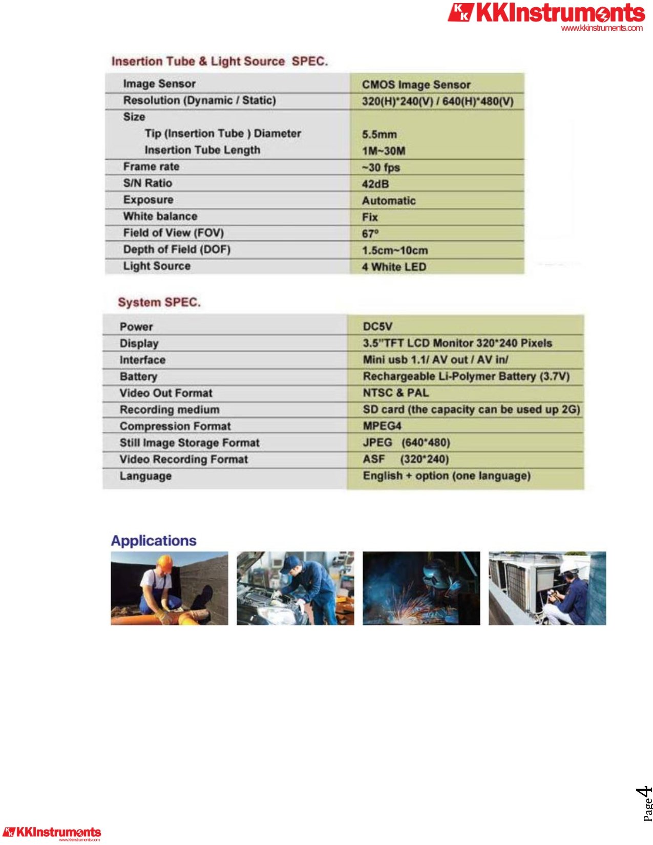 With optional accessories of 3.9 mm, 5.5mm, 8mm, 10mm, 25mm, .... diameter camera probe, it can be used to check petroleum & diesel engines, cylinder, transmission system, breaking system, suspension systems, air conditioning systems, piping/plumbing system inspection.