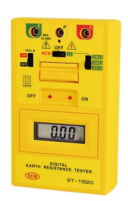 ● Capable of measuring earth resistance and earth voltage. ● 2mA measuring current permits the testing of earth resistance without tripping earth leakage current breakers in the circuit under test. ● Auto power off function. ● The timer operates automatically for about three to five minutes when the "PUSH BUTTON SWITCH" and "TIMER ON BUTTON" are pressed together. This will keep test "ON" for the duration of the timer. ● Timer for test function (count 3-5 minutes). ● Battery operated. ● Data hold function. ● Small and light weight. ● Calibration performed with supplied test leads.