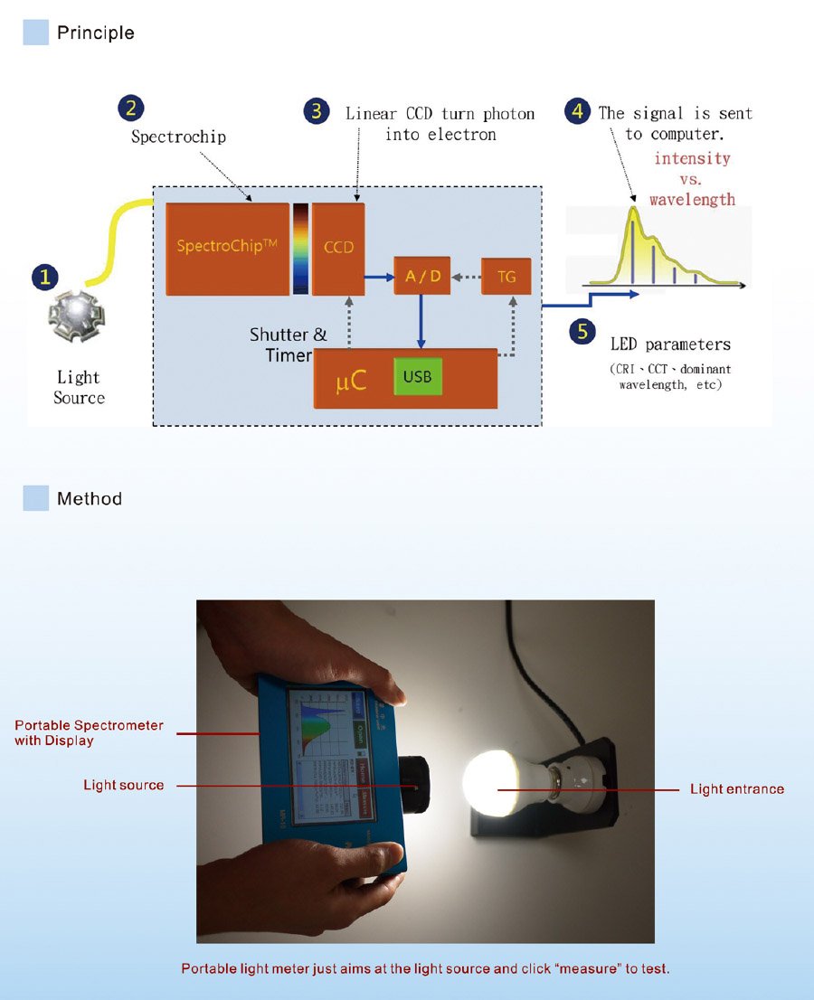 Micro-spectrometer is the core of portable light meter. Its high stability and accuracy provide diversified application.